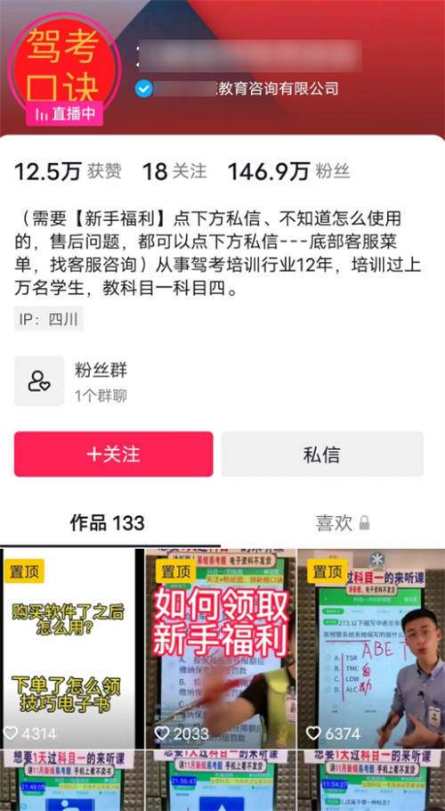 从主页上分析,这是个企业抖音号,在账号简介的就能大概判断是,他主要从事的是驾照培训的,说的更直白点,就是教你如何通过科目考试。另外,看他制作的短视频后,发现一个是新人福利领取的步骤方法,另外一个是购买了他的课程后该怎么学习的。我觉的这个点挺好,因为有太多太多的人,不知道在抖音上购买课程后,第二次要怎么进去学习了。