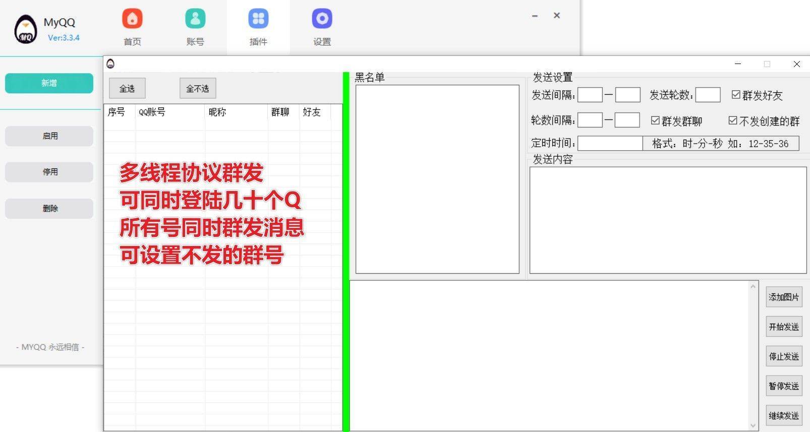 不卡顿,可几十个QQ同时群发群消息和好友消息,可设置不发的群号