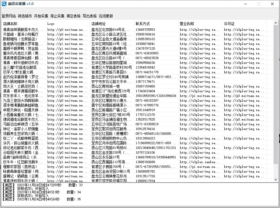 使用方法:登陆软件→点击“登陆网站” → 扫码登陆→ 点击右下角“获取信息”→ 筛选城市→ 开始采集