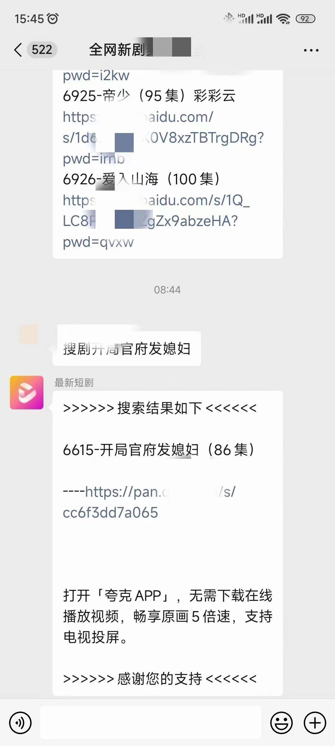 在短剧群里通过机器人指令:搜剧+剧名